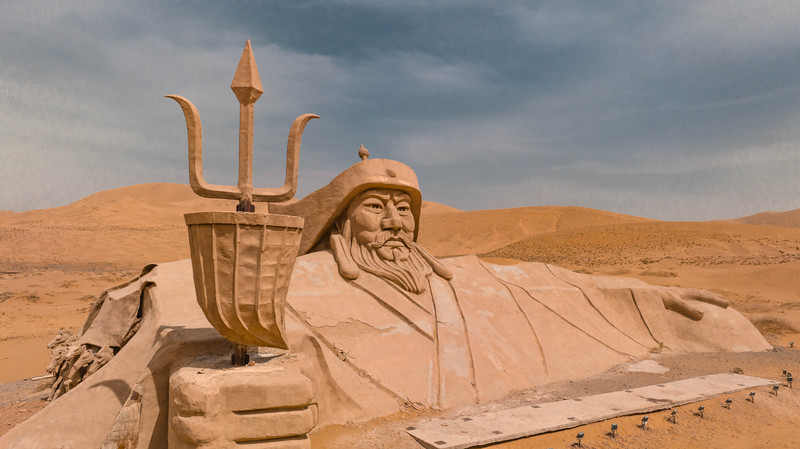 沙漠之中矗立着一代天骄成吉思汗的雕像,造型栩栩如生,威风凛凛。手持武器,依然势不可挡,即使过去多年,仍然在守候着他打下的江山,保护着他的子民。
