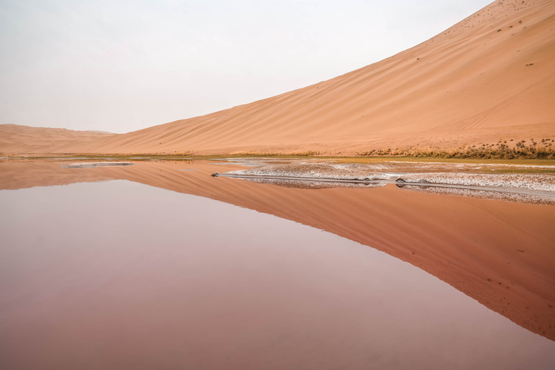 更神奇的还有双色湖,从空中看,像是一个湖被通道分为两半,一面清澈的蓝,一面是纯粹的红,日光之下颜色对比更加鲜明。太多太多的神奇在巴丹吉林沙漠里出现,目不暇接。