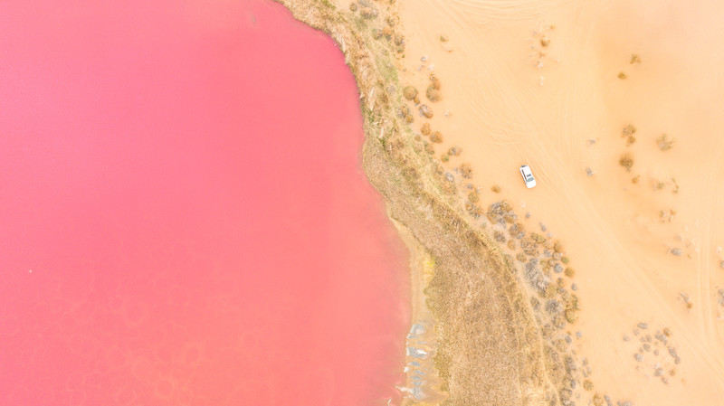 神奇的红海子是发着光的红宝石,那魅惑的红色在金黄色沙漠的衬托下令人惊艳不已,瑰丽鲜艳,仿佛是梦中的世界一般。而这迷人的红,来自于盐湖中密集的卤虫、盐藻等粉色的微生物,这是一种充满了活力的美。