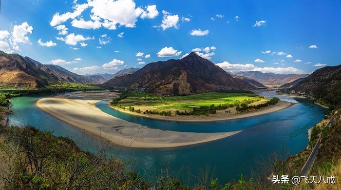 这里的江水平缓如镜,两岸是江南水乡一般的青山、整齐划一的农田和村镇,高原上有这番景致,令人称奇。