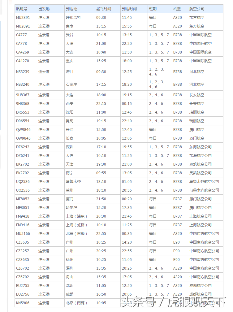 1. 机场:有一军民两用机场:白塔埠机场,位于东海县白塔埠镇,距离市区25KM。现开通航线:呼和浩特,南京,天津,重庆,石家庄,海口,大连,西安,沈阳,昆明,长春,长沙,深圳,乌鲁木齐,兰州,成都,厦门,哈尔滨,上海,北京,广州等20多个国内城市,国际航班可达曼谷。