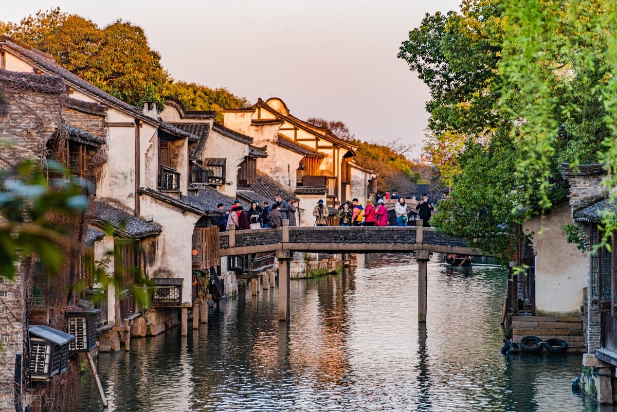 约14:00 到达【乌镇西栅】。乌镇西栅由12座小岛组成,70多座小桥将这些小岛串连在一起,河流密度和石桥数量均为全国古镇之最。例如,通济桥和仁济桥两桥成直角相邻,不管站在哪一座桥边,都可以看到一个桥洞里的另一座桥,故有“桥里桥”之称。“桥里桥”是乌镇最 美的古桥风景,堪称桥景一绝。