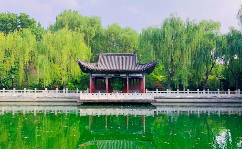 园内景色极佳,宛若江南园林,从古至今留下了多少古建筑,比如北魏时有客亭,唐时建秦琼祠堂,元时又建五龙庙,明清时期,又先后建起了灵雨亭、鲛人馆、杖影阁、倚杖桥、谈助亭、画壁、水槛等,可谓丰富多彩、令人着迷。