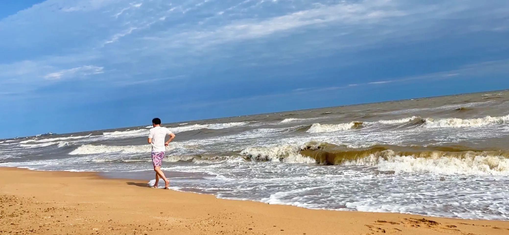 有一天刮大风,海水被泥沙搅浑,风平浪静时海水还算干净,也有沙质很细的沙滩。