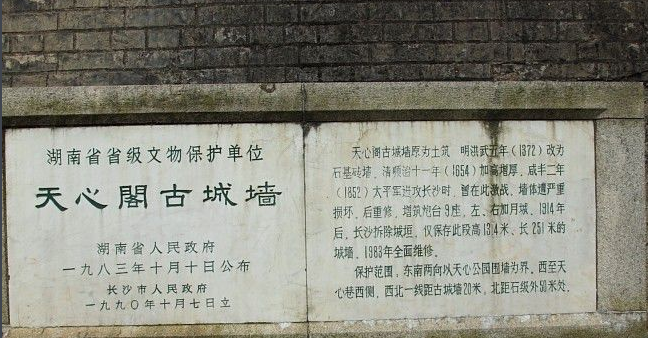 天心阁在城南路与天心路交会之处的古城墙上,是长沙古城的一座城楼。天心阁始建于明末,乾隆十一年(1746)由抚军杨锡被主持重修天心阁。阁名引《尚书》"咸有一德,克享天心"之意得名。阁楼总建筑面积864平方米,当时为全城最高处。抗战期间因文夕大火烧毁,1983年重建天心阁。