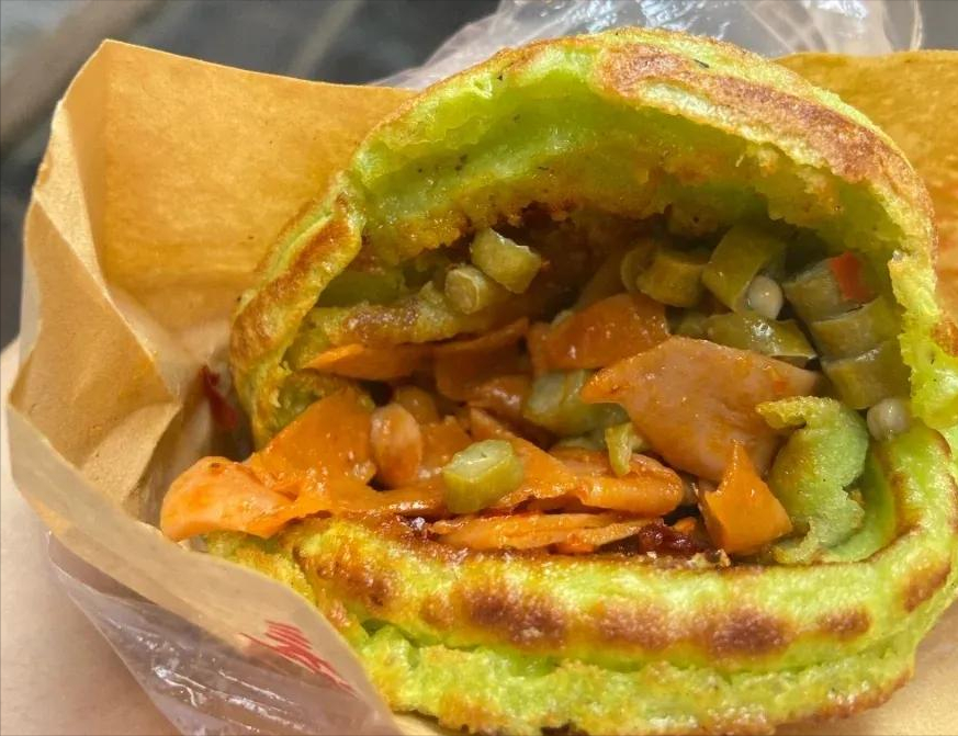 分脆皮和软皮两种,绿色软皮是绿豆、野菜和大米磨成浆做成的;白色米皮是烘烤脆的混合野菜更香。