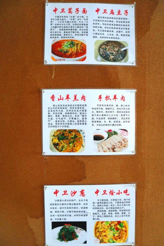 逛完中卫最美的中轴线,你一定饿了。我们再说到中卫要做的第二件事,就是寻找特色美食。第一天坐火车到中卫后,步行前往预定的客栈。在客栈里,被墙上的这个介绍所吸引。这里介绍的是中卫的特色美食,有中卫蒿子面、扁豆子面、手抓羊肉,还有沙葱。