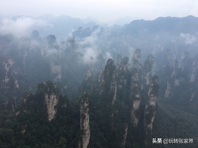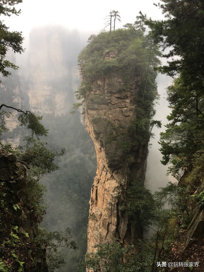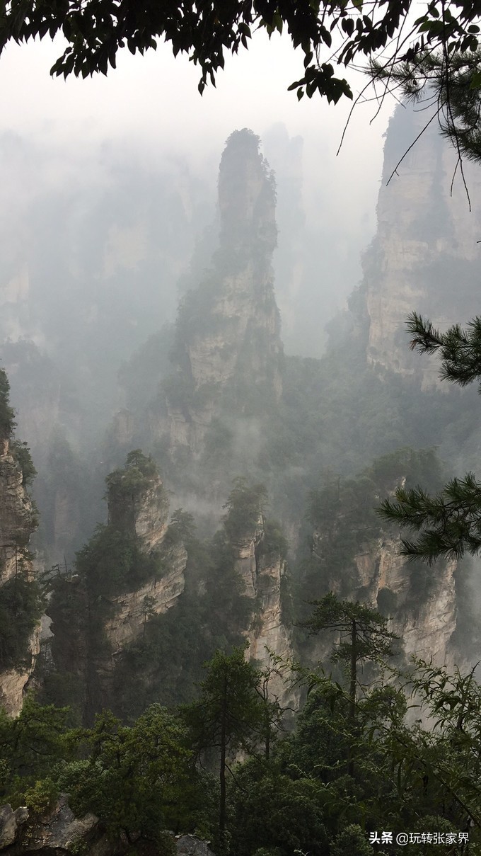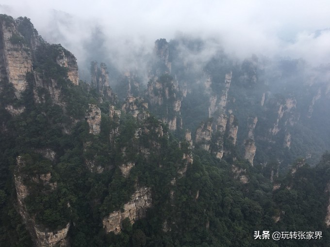 大巴行驶四五分钟就到天子山风景区了。这是旅游团必来的景点,所以人比较多。因为雾比较大,御笔峰也没怎么看清楚。景色还是确实不错。