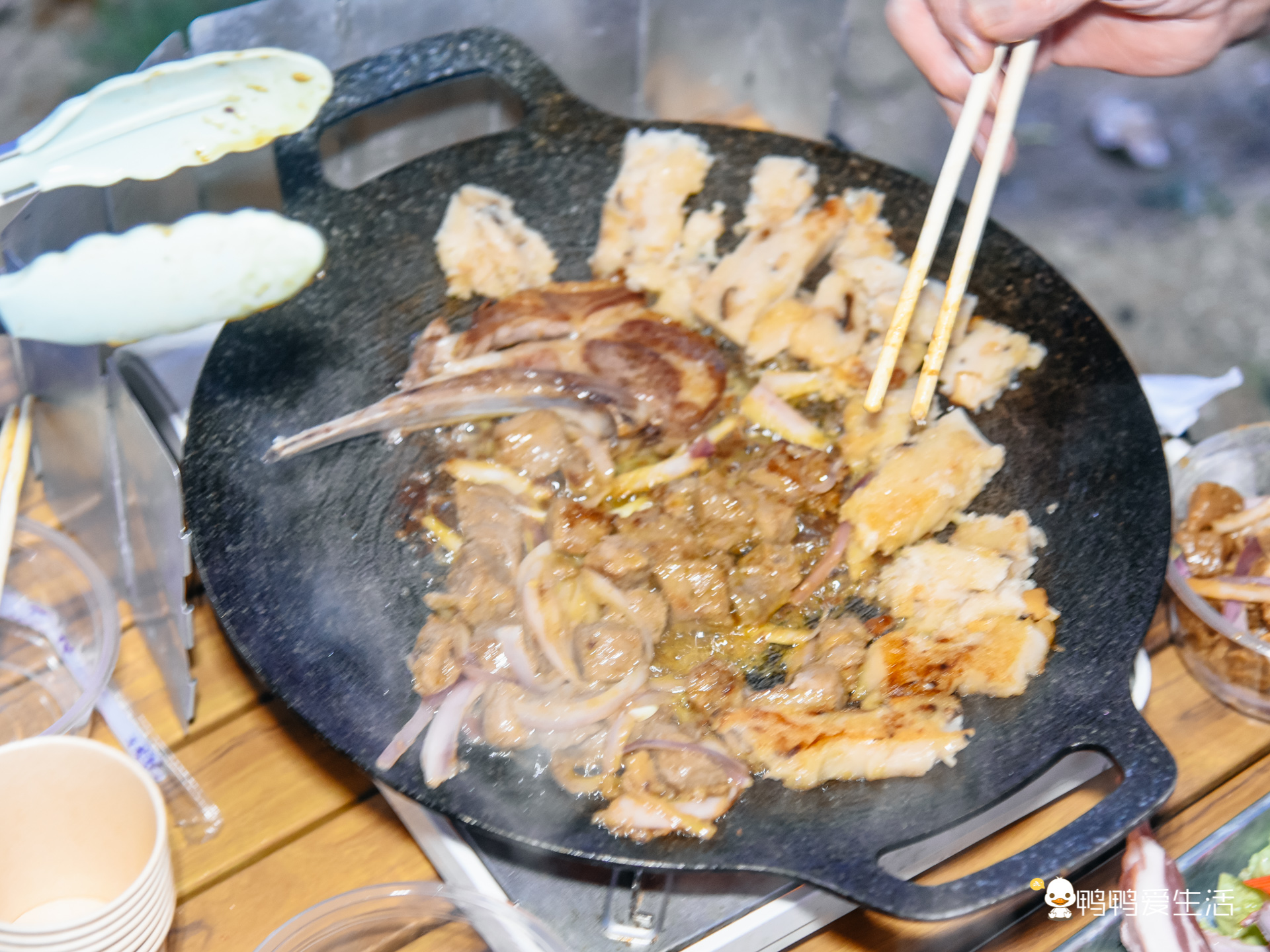 夜幕降临,在天幕帐篷下吃一个露天烤肉,看准备的这一大盘各种肉类,有羊排、鸡翅、牛肉粒等等,还有一个蔬菜拼盘,够一家子吃呢!