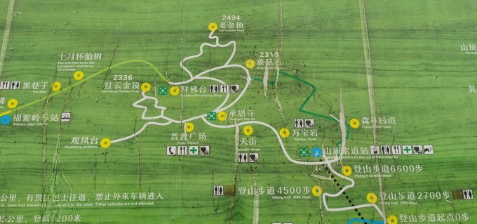 《梵净山游览简图》:停车场:长途汽车、旅游大巴、江口公交车、私家车等,都在这儿停,售票处:根本不卖票,扫码支付就可以,景区出入口:出示身份证、健康绿码,安检等,黑湾河山门往里走100多米,就是观光车停车场了,出示身份证,观光车行车25分钟,终点为索道下站,也是步行登山的起点,索道上站:往返索道140元,20分钟。蘑菇石:这儿也是去老金顶和红云金顶的岔路口。老金顶:海拔2494米。普度广场:也是服务区,附近有承恩寺,从这儿上红云金顶,然后返回在此,另路下山到索道上站,红云金顶:网红打卡地,最壮观的风景。