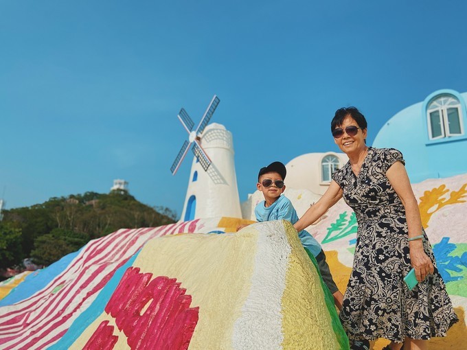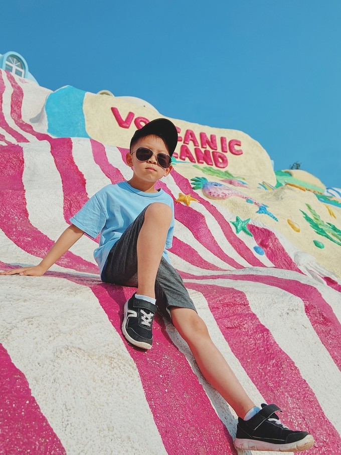 拿了地图往里走,火山岛还是蛮大的,烧烤花了点时间,去的比较晚,直接冲去第一个拍照点——彩虹山,这个景点在进门右手边,沿着竹林一直走,位于原来的房车基地。小山坡非常绚丽多彩,涂满了各种颜色的和文字,看起来很温馨,与最上层的风车、蛋屋组成浪漫的童话色彩。这是媳妇最想拍照的地方,花了很多时间,以至于后面的行程非常赶。