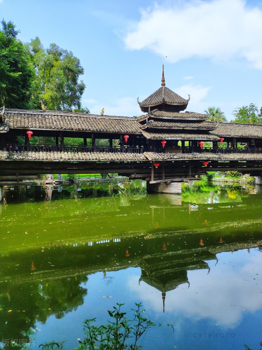 古色古香的民族文物苑,隐藏在闹市中,也是南宁难得的清净之地。走进中式庭院之中,可以看到有各式各样的广西少数民族民居建筑,还有侗族风雨桥,以及苗族吊楼的建筑被湖水环绕,树木映衬,加上喷泉烟雾,增添了仙气飘飘之感。
