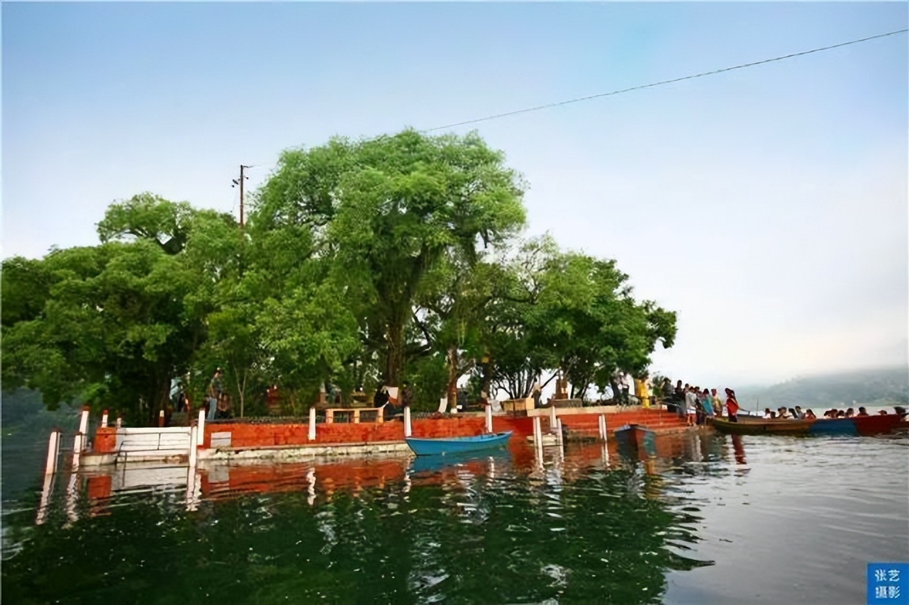 小伙伴们坐在木舟上谁也没有闲着,看着山湖水色如此秀美,个个都拿出相机拍照。此时周围的峰峦也逐渐被染红,与湖水交相辉映,充满绚烂之美。湖中有湖心岛,岛上有一个印度教的神庙。西岸是森林覆盖着的山峦。