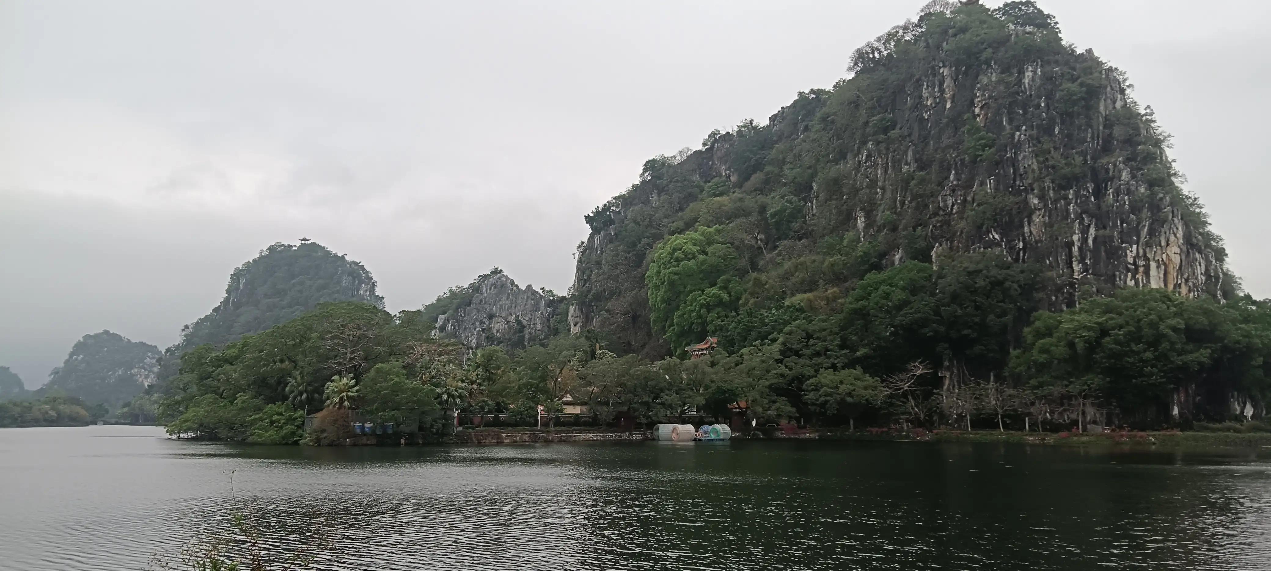 我去的太迟,没赶上肇庆的早春,大部分紫荆花已凋谢。也许是中午时间,也许是天气不太好,没什么游人,四周寂静。只身在闹市又像在山野,没有人声鼎沸,没有城市的喧嚣。偶有鸟鸣,居然看到只二三十年未见过的翠鸟!隔湖往南看,有数座山峰耸立在水边,山势挺拔陡峭,十分的雄伟俊美,山上有凉亭一座。山连水水映山,山水相依。人生在此,处天地山水之间,心波不澜,于大自然中,感天地之神奇,悟人生之短暂。