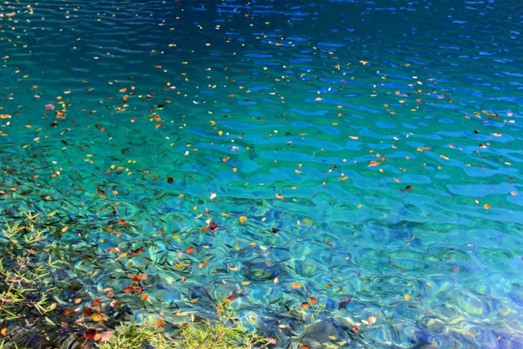 岸边呈七种颜色的树叶与水中倒影交织纠缠