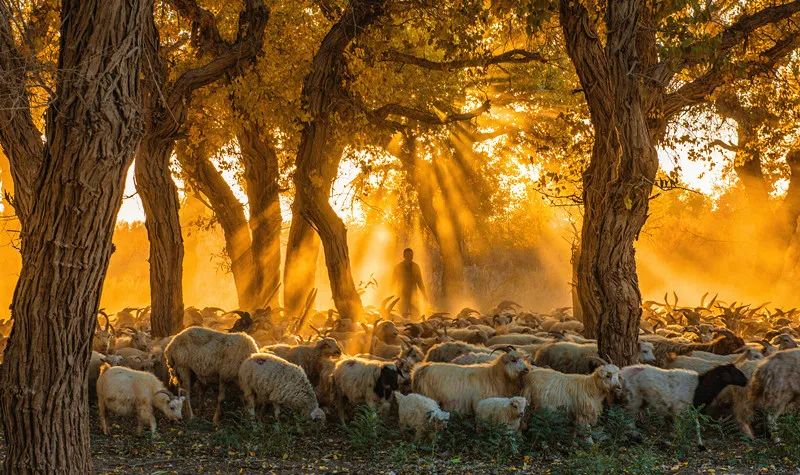 骑马的牧民,不慌不忙,吃草的牛羊悠闲惬意