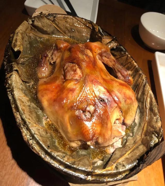 鸡是当地的小草鸡、在两三斤的样子、涂上酱料、用荷叶包上、用黄泥包裹着、用果木烘烤、味道很香浓。