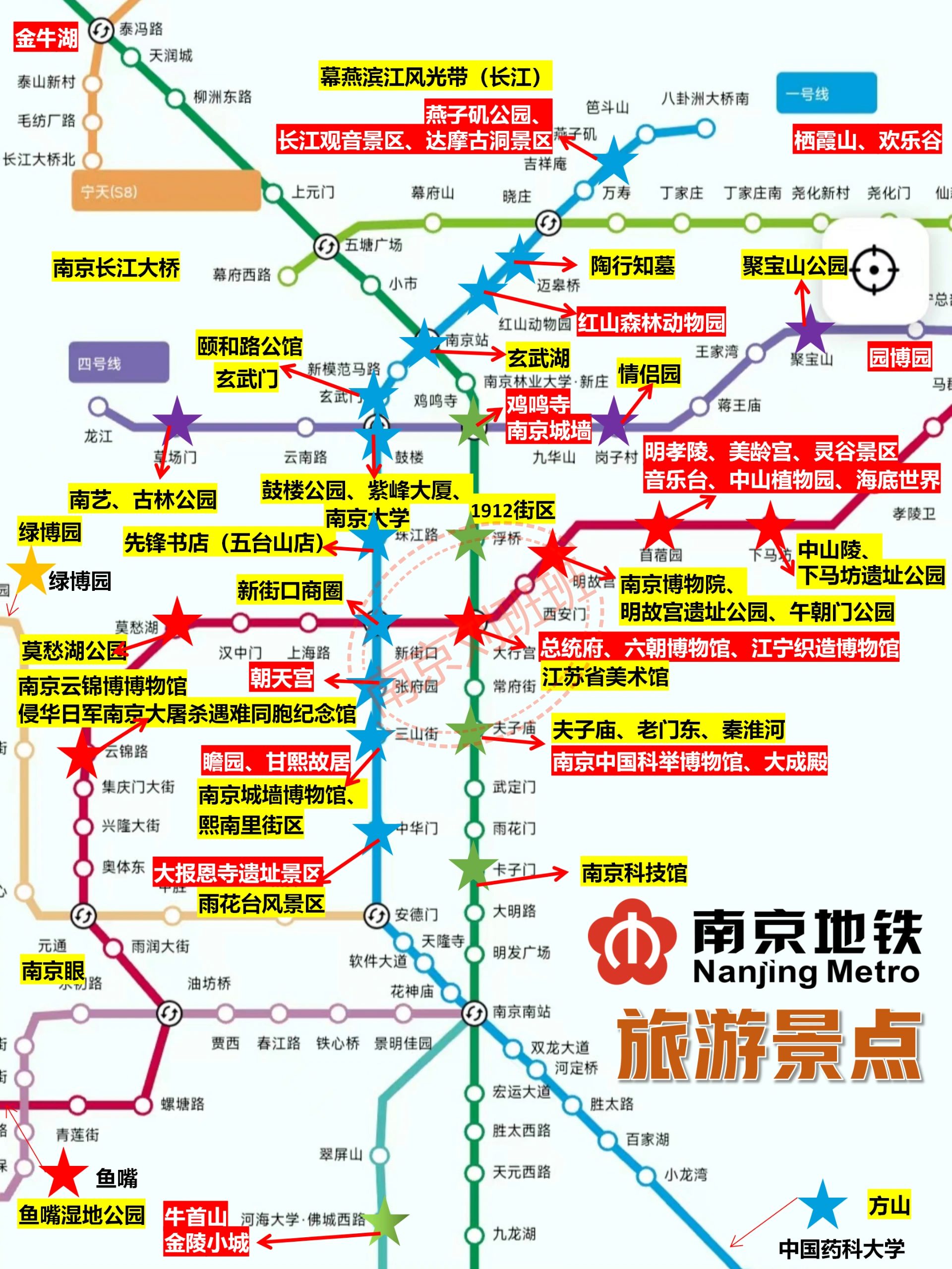 ⚠️地图参照南京地铁线路图,景点位置仅供参考 ⚠️注:图一黄色地点为免费景区,红色地点为收费景区图二绿色地点为免费景区,黄色地点为收费景区~