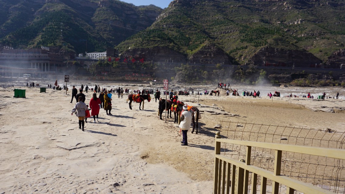我们交了20元的停车费,把车开进了停车场。停好后便去游客中心买票。门票是120元一张,两张共花了240元。购完票我们就坐上了景区的大巴车驶向壶口瀑布。下了车,便是景点。一进入景点,站在高处放眼望去河滩上是一马平川,根本就看不到瀑布的影子。