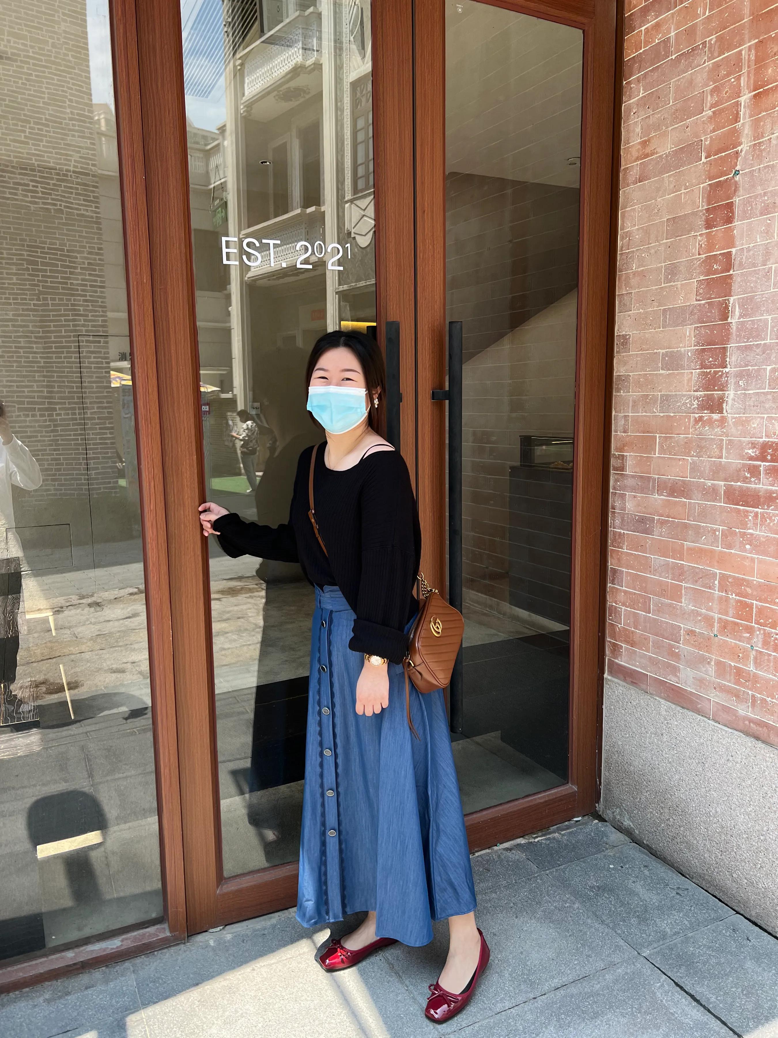 自古红蓝出CP,今天走一回牛仔蓝色长裙配红色平底鞋[机智]@说日语的小虎牙