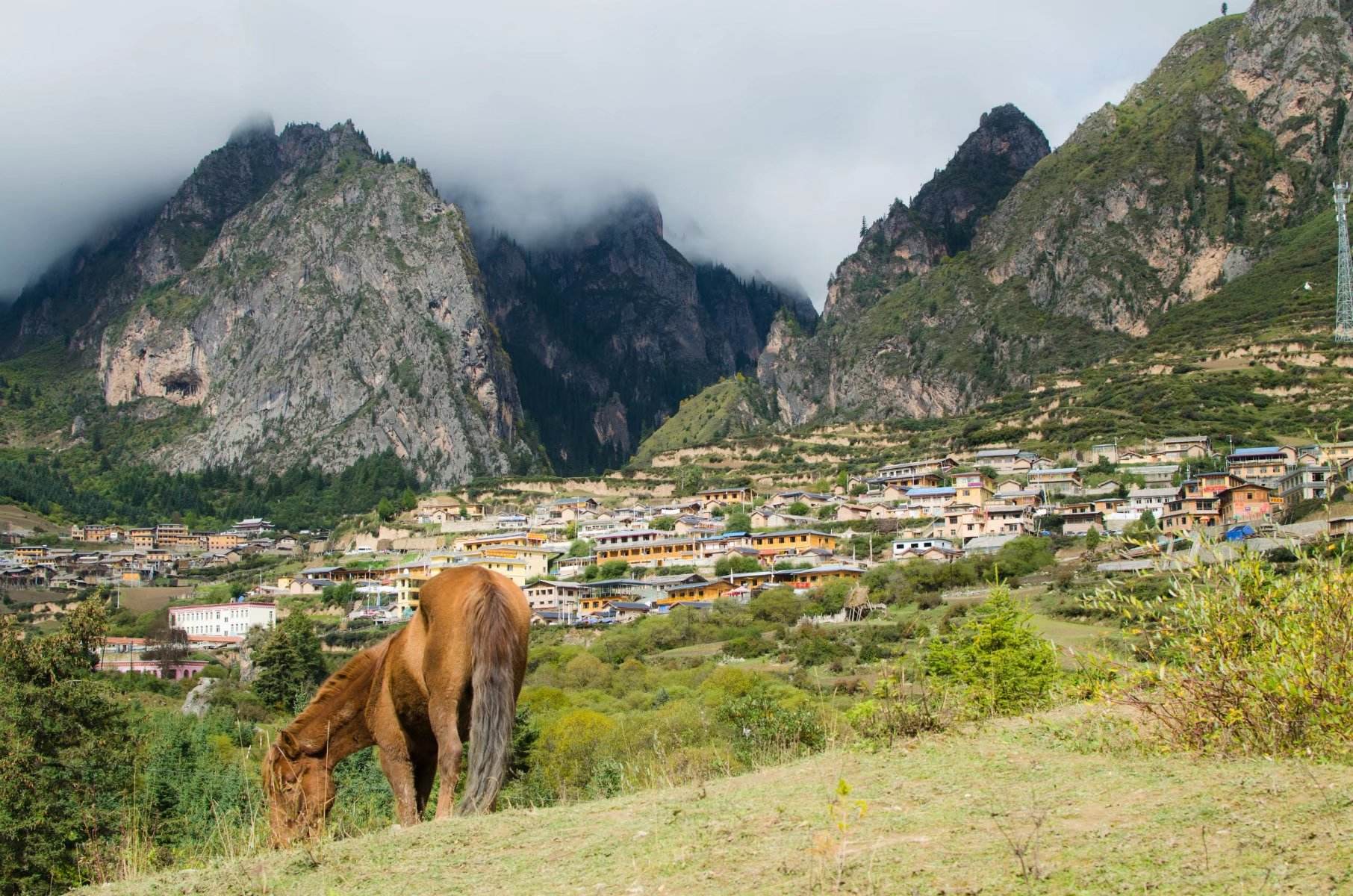 远远望去遍布宛若火柴盒的榻板房舍和田园风光,藏寨内游牧、农耕、狩猎和樵采等多种活动合理搭配和互补融合,成为人与自然和谐相处的一个典范。