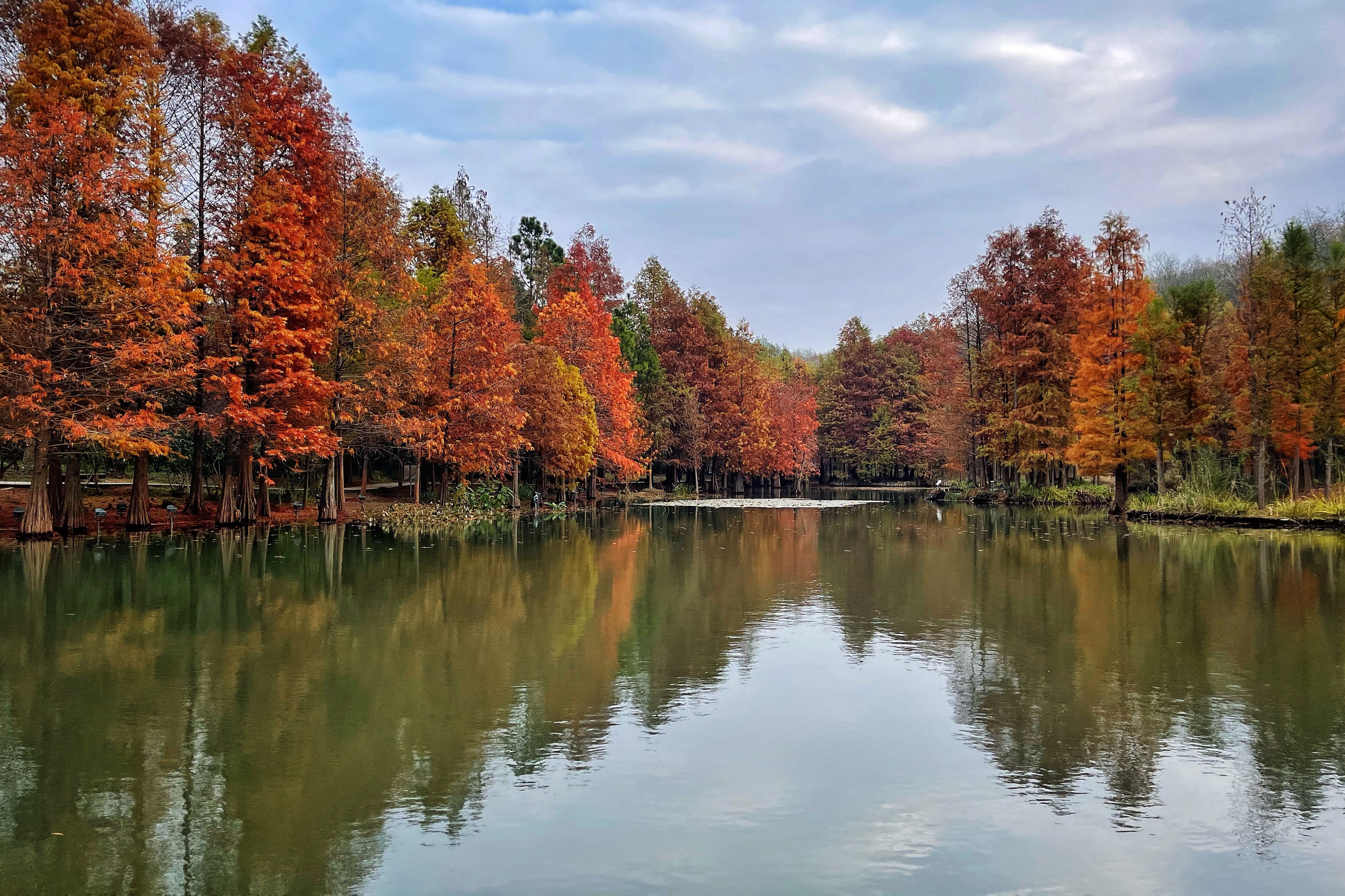 我是从明孝陵的3号门进入的,上图是我的游览路线。选择3号门主要是想拍摄下图的这片水杉树。这个季节树木的色彩很丰富,再加上水面的倒影,景色非常宜人。
