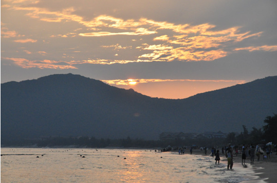 亚龙湾海滩被誉为三亚最美的海滩,这里的海水很清澈,虽没有那么湛蓝,没有那么碧绿,但它天然的南国风光是其他海域无法与之媲美。此时的亚龙湾,已是傍晚时分,一抹夕阳将岸边起伏的波澜幻化出五彩虹霓,游人剪影驳杂,沙滩红光普照,景色煞是诱人。