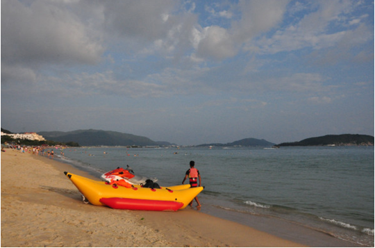虽然可以走在海滩上欣赏高级酒店,但是重点还是欣赏蓝天白云大海沙滩的。亚龙湾确实很有气势,浪大,滩平,很平,水清,透着宝石的光泽。沿着沙滩一直的走啊走,海水实在是太清澈,可以看到跟着浪花被打上来的小鱼,就在你的脚边欢快的游着,海上可以看到很多娱乐项目,遍布着游艇,拖拽伞,香蕉船,水上摩托等等等等……运气好还可以看到军舰,因为旁边有一个军事码头。