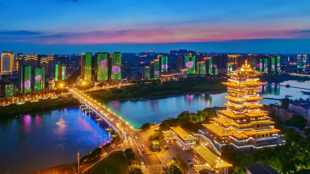 入夜后,越王楼才真正彰显出它的魅力。除了楼宇本身的灯光外,不远处涪江两岸的灯光秀,交相辉映。
