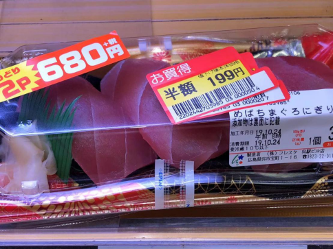 看看这价格,生鱼片和日本矿泉水差不多一个价了,折合人民币就十几元。在超市,实现生鱼片自由,soeasy。