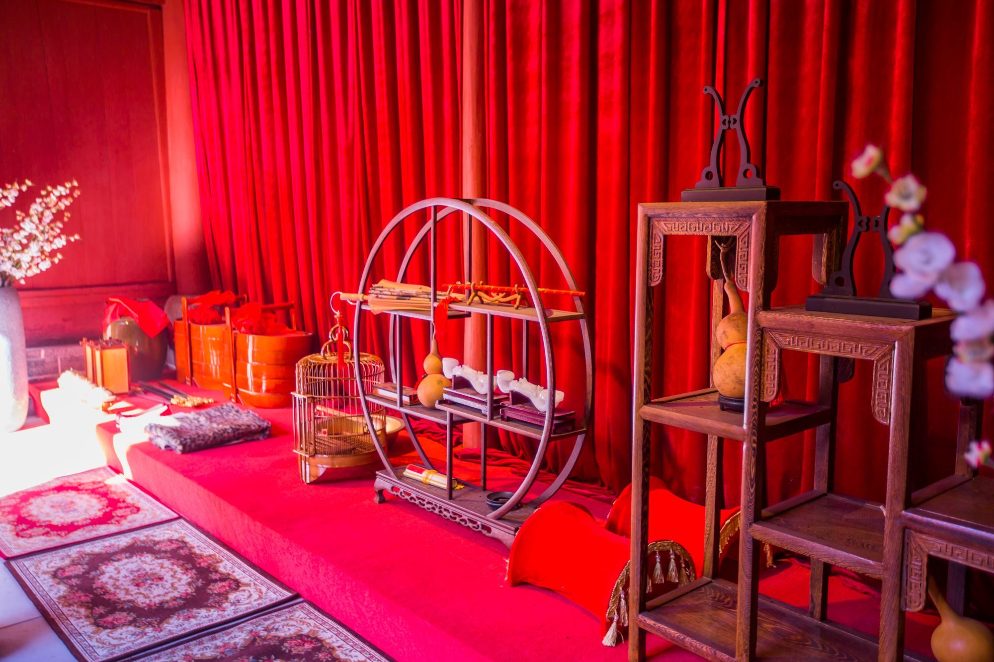 红灯笼、红绸带、红步道,婚俗嫁妆还原了当地古时婚礼现场。婚服婚品展示区、中华传统婚嫁习俗文化展示区、中式婚礼工具陈列区、婚礼仪式主舞台、景观亭以及宫灯等让人大开眼界。