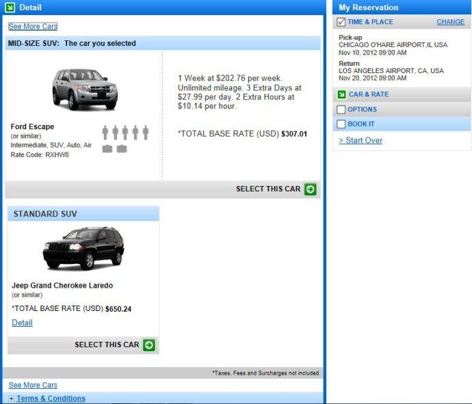 了解以上信息,我们以THRIFTY租车公司为例,图解网上租车的预订流程。计划在11月10日芝加哥机场租车,11月20日洛杉矶机场还车,车型为SUV: