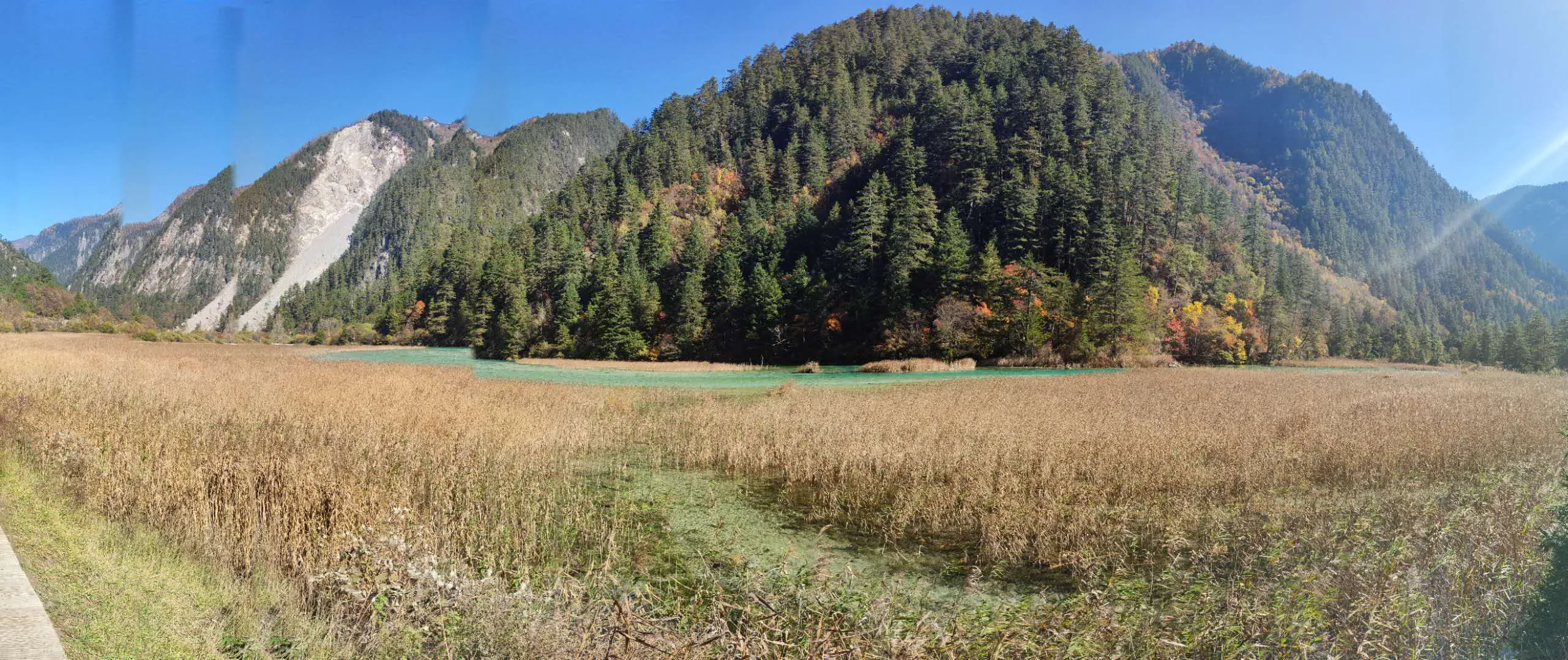 第二天一早我们就开车出发,九寨沟景点附近停车一律三十,我在网上订的门票,结果到了检票发现没带身份证,可喜的是这景区很少见的竟然输入身份证号也可以,总算是不用再跑到车上拿身份证了,感觉省了两万步。。。景区全程公交车禁止私家车进入,特别方便也特别明智,一路上公交车上的电子讲解系统每到一个景点就会讲解此景点的故事历史和地理信息,让你在感受大自然雄起壮丽的同时似乎也学到一点东西,让旅游更加旅游,不在仅仅是游玩。景区景点路线整个是一个Y型,公交车一路向上,先去最好的诺日朗瀑布,然后再由我们一站景点一站景点的游览,公交车很多,完全不用担心等车时间长,我们就这样一站一站的,有走路也有坐车,游览了好多个美丽的风景,特殊的是这个景区没有一般景区都有的一个点一个点的歇脚小商店,不得不说景区管理的真的很好,就一个景区特色产品商店和饭店集中点在景区服务中心,有自助和饭堂,自助没体验过不说了,饭堂饭菜有点单一,就吃几种面食或者吃几种盖浇米饭,还有点贵,面三十,米饭五十多,但