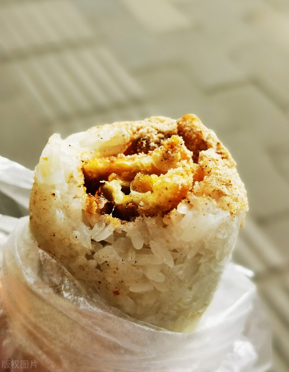 4、糯米团包油条,这是老重庆的一道经典早餐,糯米饭团外裹一层香喷喷的黄豆面、内包一节酥脆的油条,来一个,美味又顶饱。还可以和豆浆、稀饭搭配。