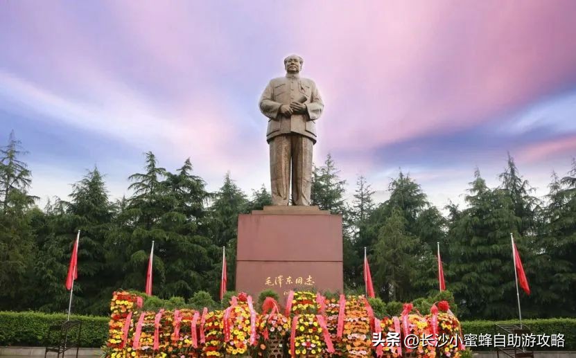 毛主席铜像,重3.7吨,雕像高6米,基座高4.1米,共10.1米,象征着十一国庆,开国的日子,。集体佩戴毛主席像章、系上红领巾,也可集体向毛主席铜像敬献花篮。