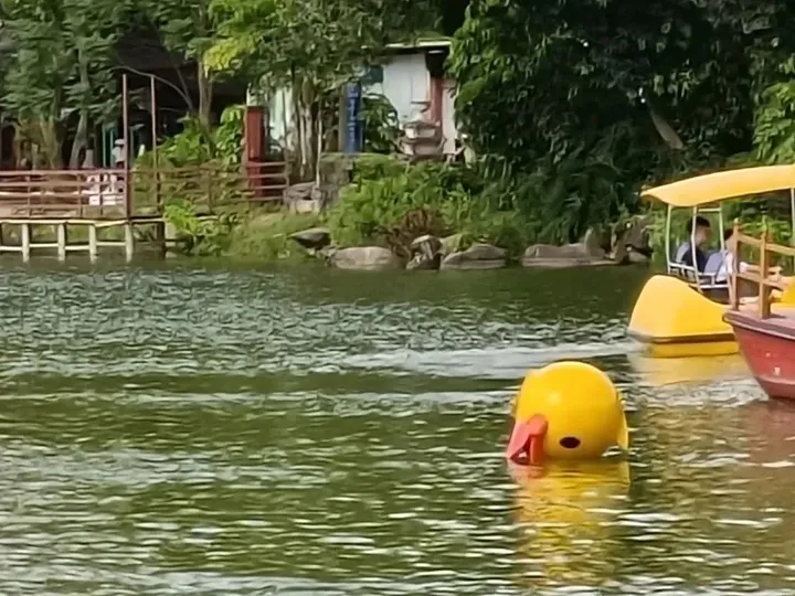两条小船不小心撞到发生碰撞,一艘船上小黄鸭的头都被撞掉了