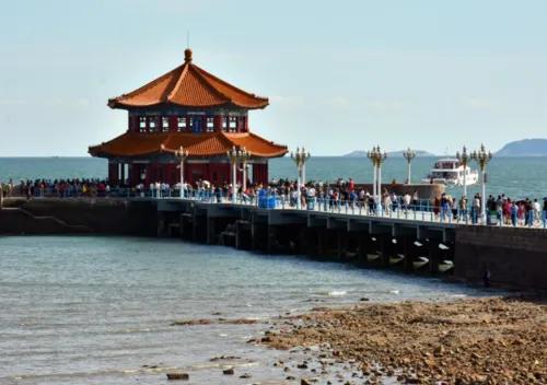 青岛栈桥位于游人如织的青岛中山路南端,桥身从海岸探入如弯月般的青岛湾深处。桥身供游人参观并在此停靠旅游船,由此乘船可看海上青岛。青岛栈桥始建于清光绪十八年(1892年),是青岛最早的军事专用人工码头建筑,现在是青岛的重要标志性建筑物和著名风景游览点。青岛栈桥全长440米,宽8米,钢混结构。桥南端筑半圆形防波堤,堤内建有民族形式的两层八角楼,名“回澜阁”,游人伫立阁旁,欣赏层层巨浪涌来,“飞阁回澜”被誉为“青岛十景”之一。桥北沿岸,辟为“栈桥公园”,园内花木扶疏,青松碧草,并设有石椅供游人憩坐,观赏海天景色。