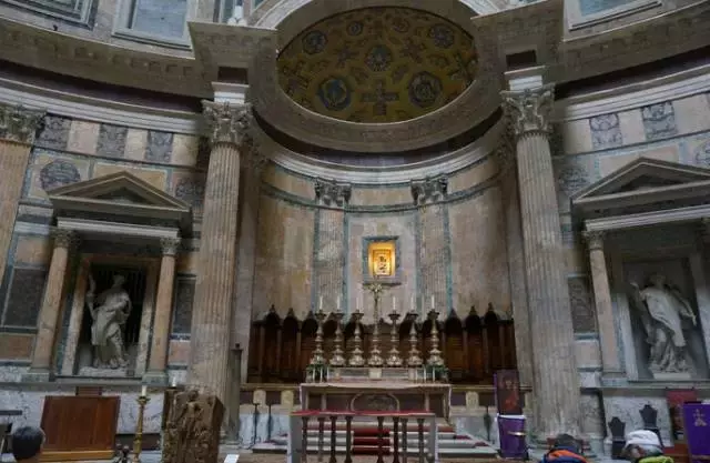 从门廊正面的八根巨大圆柱仍可看出万神殿最初的建筑规模,门廊顶部则刻有宫殿初建时的纪念性文字。
