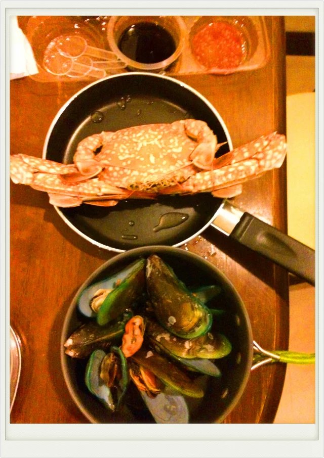 乐颠颠的开始选购海鲜,本着跟着当地人买的原则,虾、一种蓝色的螃蟹、海虹、还有一袋泰米(事实证明这个决定是准确的,当时买了两种虾,一种是跟着别人买的,另一种是看着漂亮价格还贵一些,但是味道远远不及当地人的选择)。神奇的7-11买的调料:酱油、一种当地人吃的酸辣酱;两个人屁颠屁颠的跑回宾馆开始了海鲜大餐。食材新鲜,味道鲜甜,蘸着辣酱特别棒。奇怪为什么在泰国人的菜单里海鲜老是要放很多的咖喱、之类的东西。白水煮煮不是挺好吗?