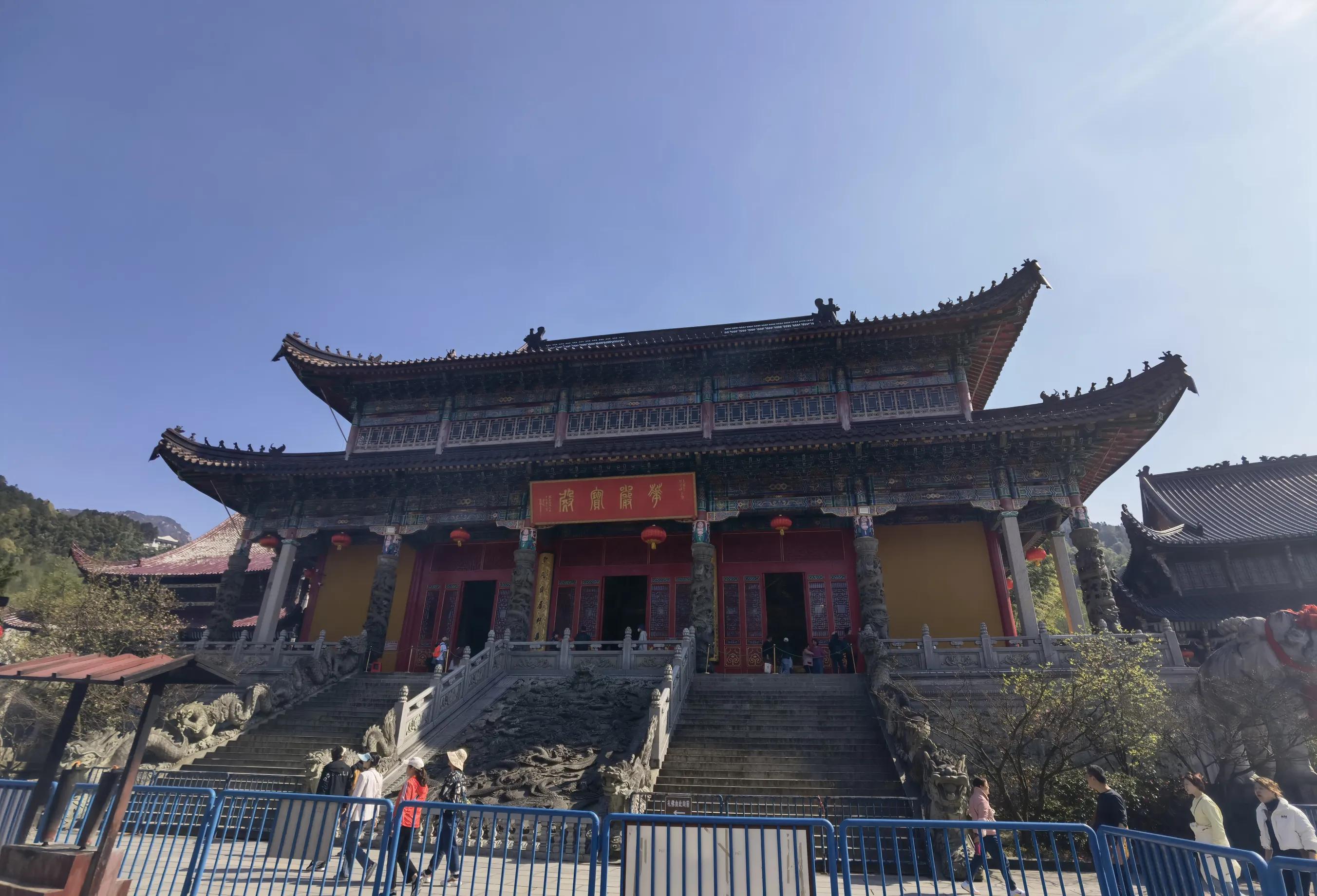 拜过回香阁和万佛塔,注意不要走下山的路,此处容易走错,如走错下山后,还得再爬几百米的山去月身宝殿,沿右边的小路直行,一直走到地藏宝殿,地藏宝殿的后身就是月身宝殿(国保),这是九华山必去寺庙之一,供奉唐代高金乔觉肉身,月身宝殿建筑规模宏大,信众虔诚参拜人数众多