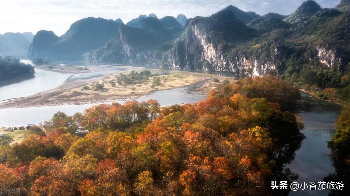位于广西壮族自治区桂林市,以其独特的喀斯特地貌而闻名。乘船游览漓江,途中可以欣赏到秋天的桂林山水美景,如画般的秋叶和峰峦叠嶂。