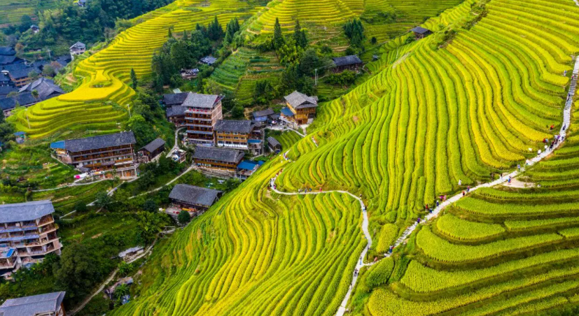 ✔龙脊梯田:龙脊山区是一个山峦起伏的地区,梯田沿山势而建,形成了壮观的景观,梯田从山脚一直延伸到山顶,形成了一幅幅层层叠叠的画面。梯田的形状各异,有的像龙鳞,有的像脊梁,因此得名“龙脊梯田”。