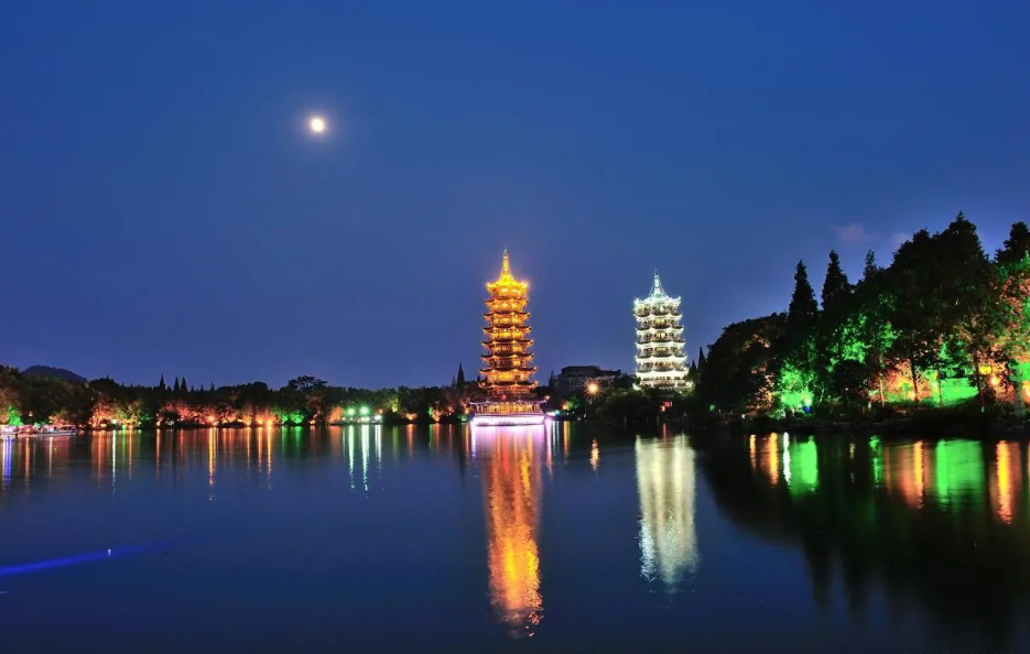 ✔两江四湖:景区两江包括漓江、桂江。四湖包括木龙湖、鸳鸯湖、叠彩湖和滕子岗四个湖泊,以及连接它们的水道和桥梁。夜晚可以乘船游览两江和四湖,欣赏到炫丽缤纷的湖光山色。
