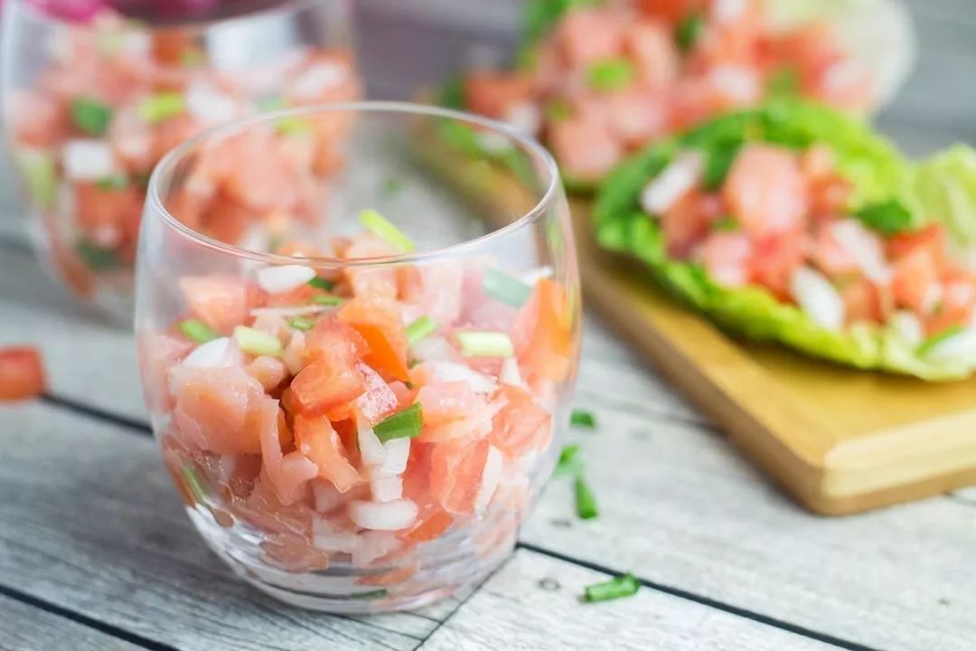 用腌制的三文鱼,肉末,西红柿丁和洋葱一起烹制,红红绿绿的,不细看的话还以为是墨西哥的Salsa sauce,口味却别具一格。