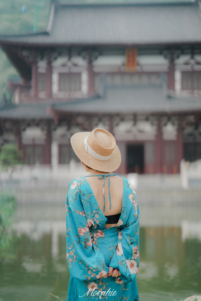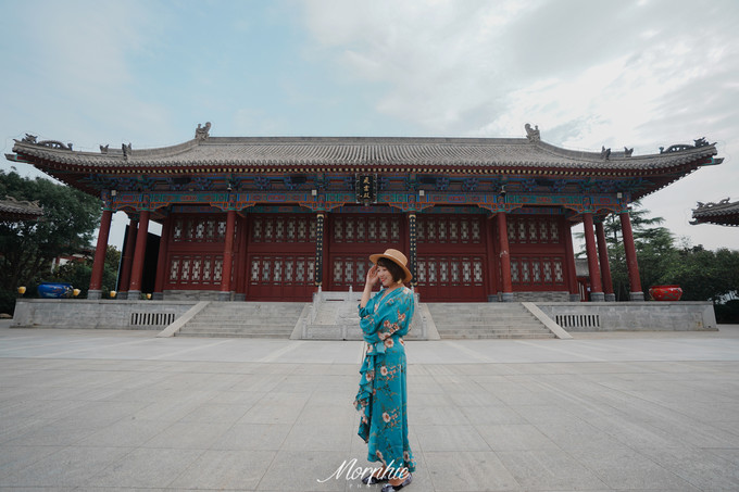 华清宫以古典的朱红色为主色调,选择蓝色连衣裙在颜色会形成反差,突出人物主体。连衣裙的图案和款式如果也有古典的元素,就更适合啦~