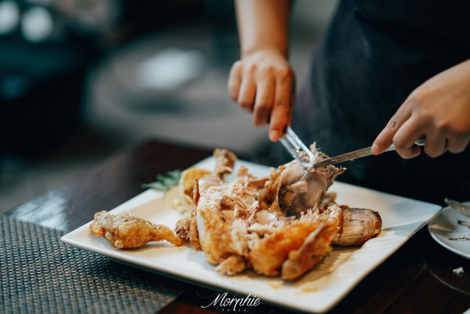 老陕葫芦鸡:葫芦鸡是陕西名菜,始于唐朝,和华清宫的唐文化非常匹配了。鸡肉经过清煮、蒸笼、油炸三步,整体呈现出迷人的金黄色,看起来就垂涎欲滴。店员亲自现场剔骨,之后还能复原成一只整鸡的外形。口感可以用炸裂来形容!真正的皮酥肉嫩,筷到脱骨、入口即化~