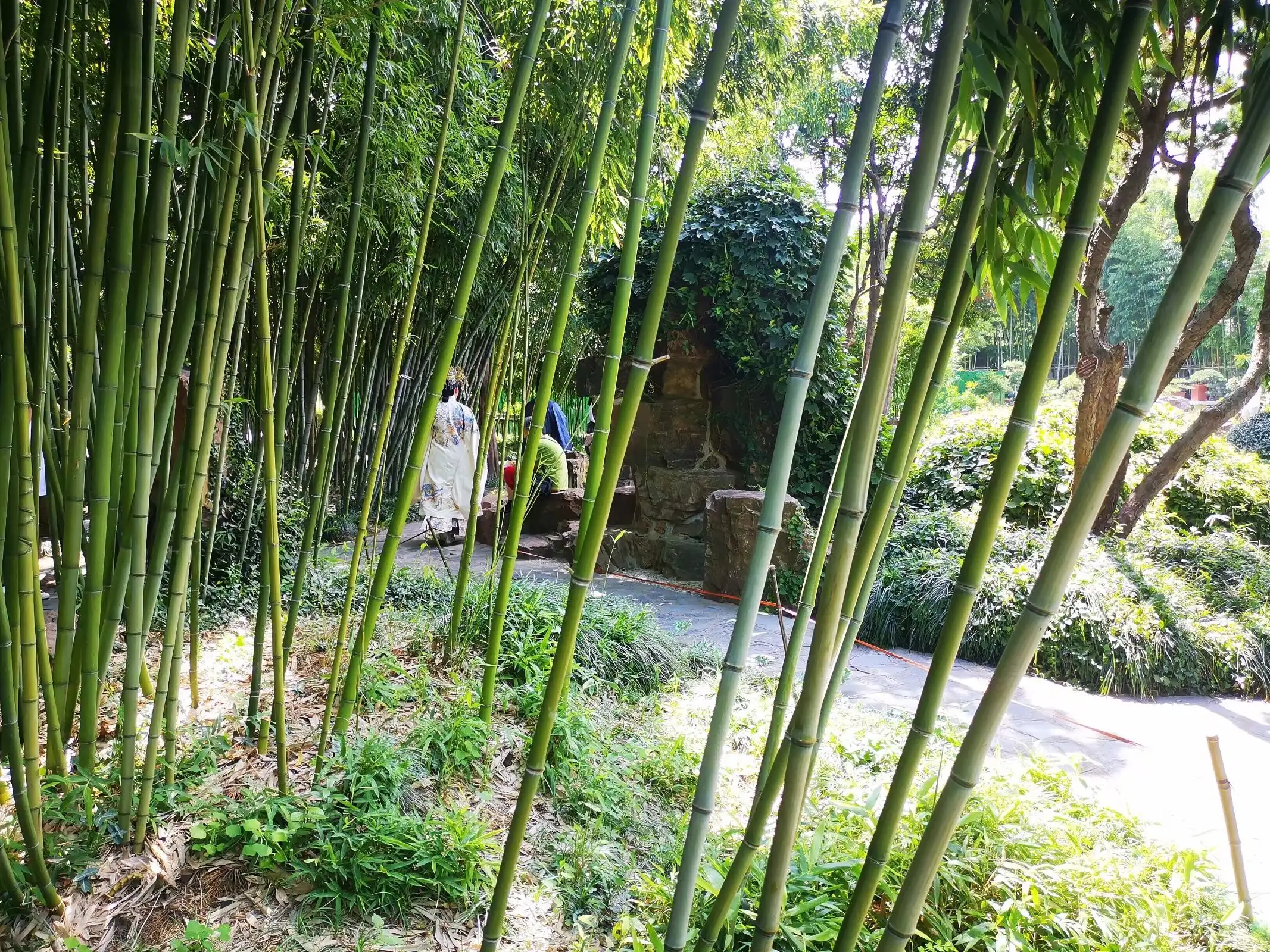 个园主人喜欢竹子,给园子取“竹”字的一半,叫个园。个园如其名,从北门进去,是个园后花园,几乎全是竹子,一片翠绿,真是“宁可食无肉,不可居无竹”啊。竹园里有池子,池子有廊阁,有一对新人在拍照。这样的环境好,显得新娘都漂亮些。