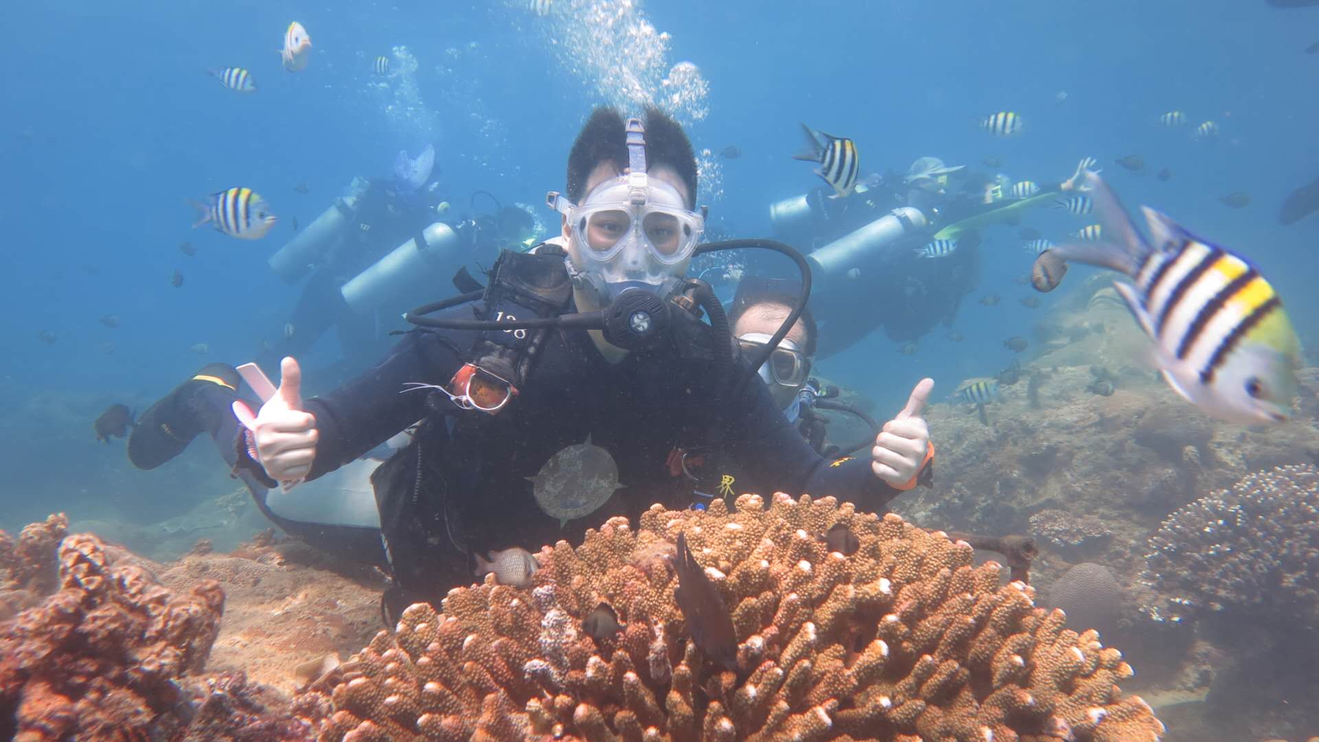 适应水压后,就没事了,调整好呼吸,记得珊瑚不能摸哦