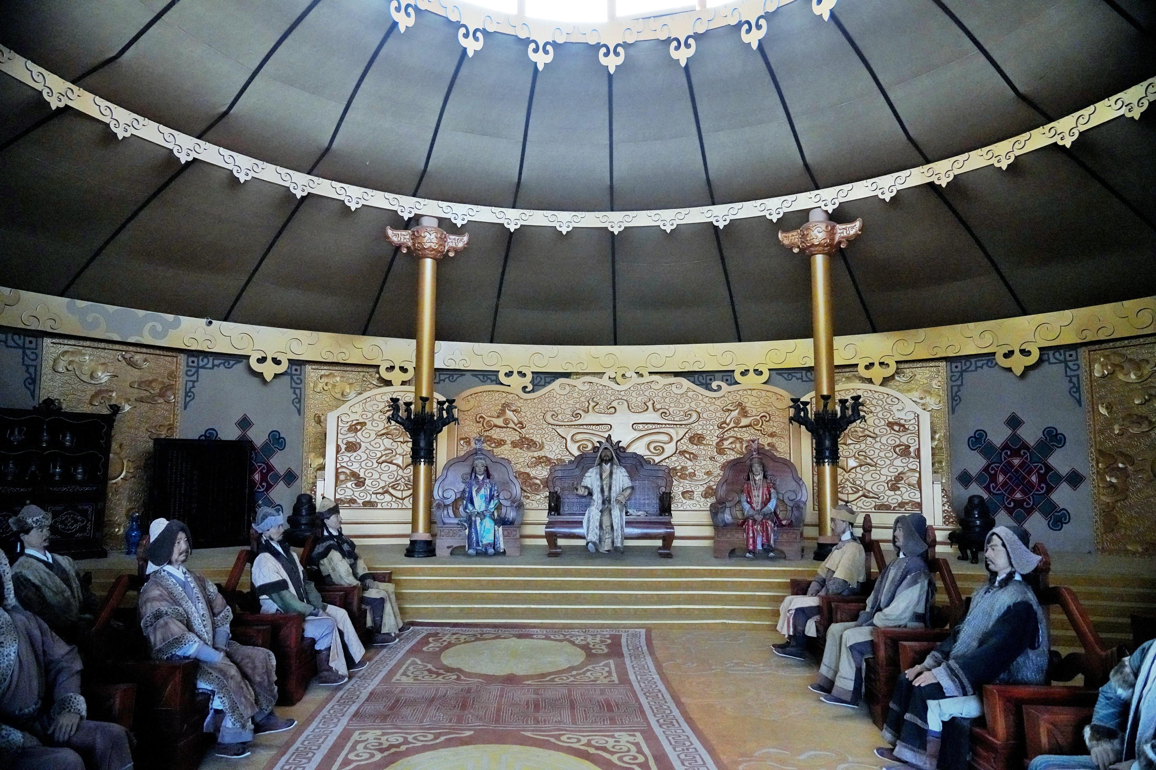 大汗行宫宫殿区:占地30万平方米,宫殿范围内由宏伟壮阔的宫门、代表民族信仰的长生天牌坊、战场上的金戈铁马的还原场景、独具特色的议事金帐、具有强烈宗教色彩并象征神在其位的敖包和集佛教、道教、萨满教于一体的祭天台等建筑共同构成景区中轴线。