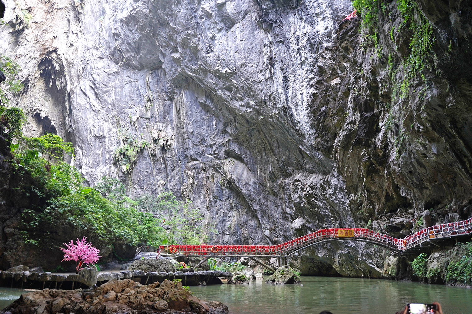 两岸钟乳林立,石笋如画,晶莹斑斓,而且坑内的景观也非常多,七彩仙境天瀑,天然观音像、莲花宝座、姻缘桥等等,每一处都别有意境,都值得参观打卡。